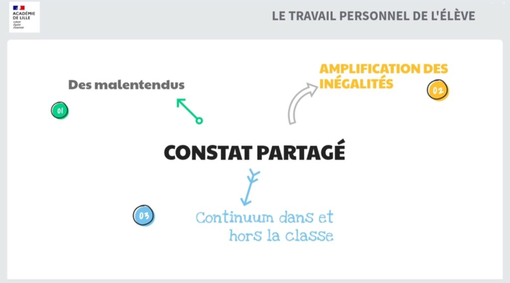 Le travail personnel désigne donc non seulement les devoirs à la maison, mais également le travail effectué dans la classe, lorsque l’élève est directement confronté aux apprentissages.