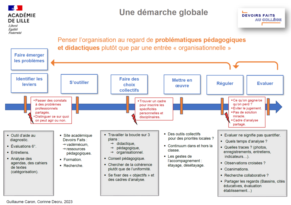 Ce schéma illustre une démarche d’accompagnement, possible, des équipes éducatives pour structurer leur réflexion sur le travail personnel des élèves, en articulant l’identification des enjeux, la prise de décision collective, la mise en œuvre, la régulation et l’évaluation des actions. L’approche vise à favoriser une dynamique collective et réflexive, avec des outils adaptés aux réalités locales.![]()